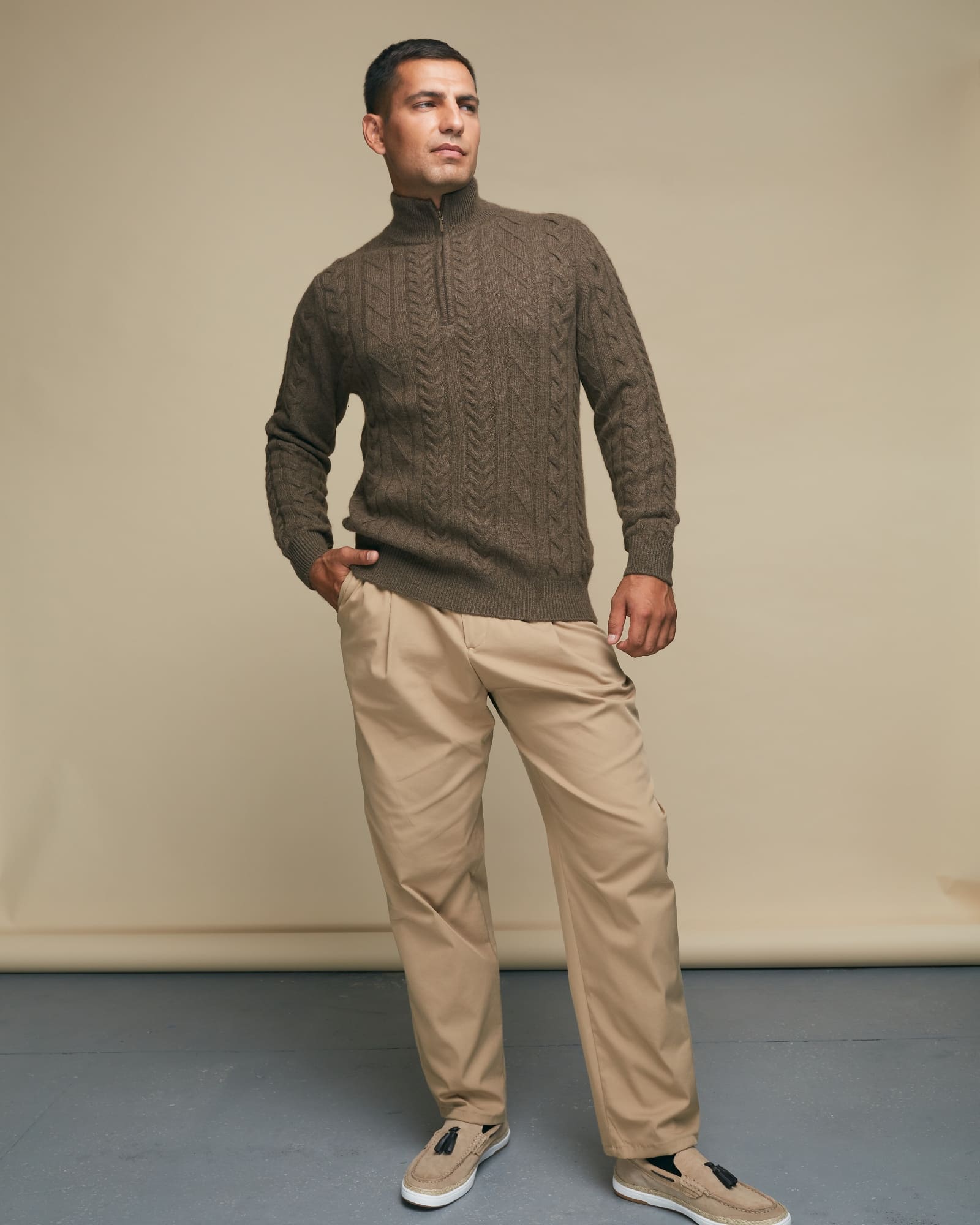 Прямой крой с воротником-стойкой и короткой застёжкой на молнии. Рельефная вязка придаёт изделию выразительность и современный характер.