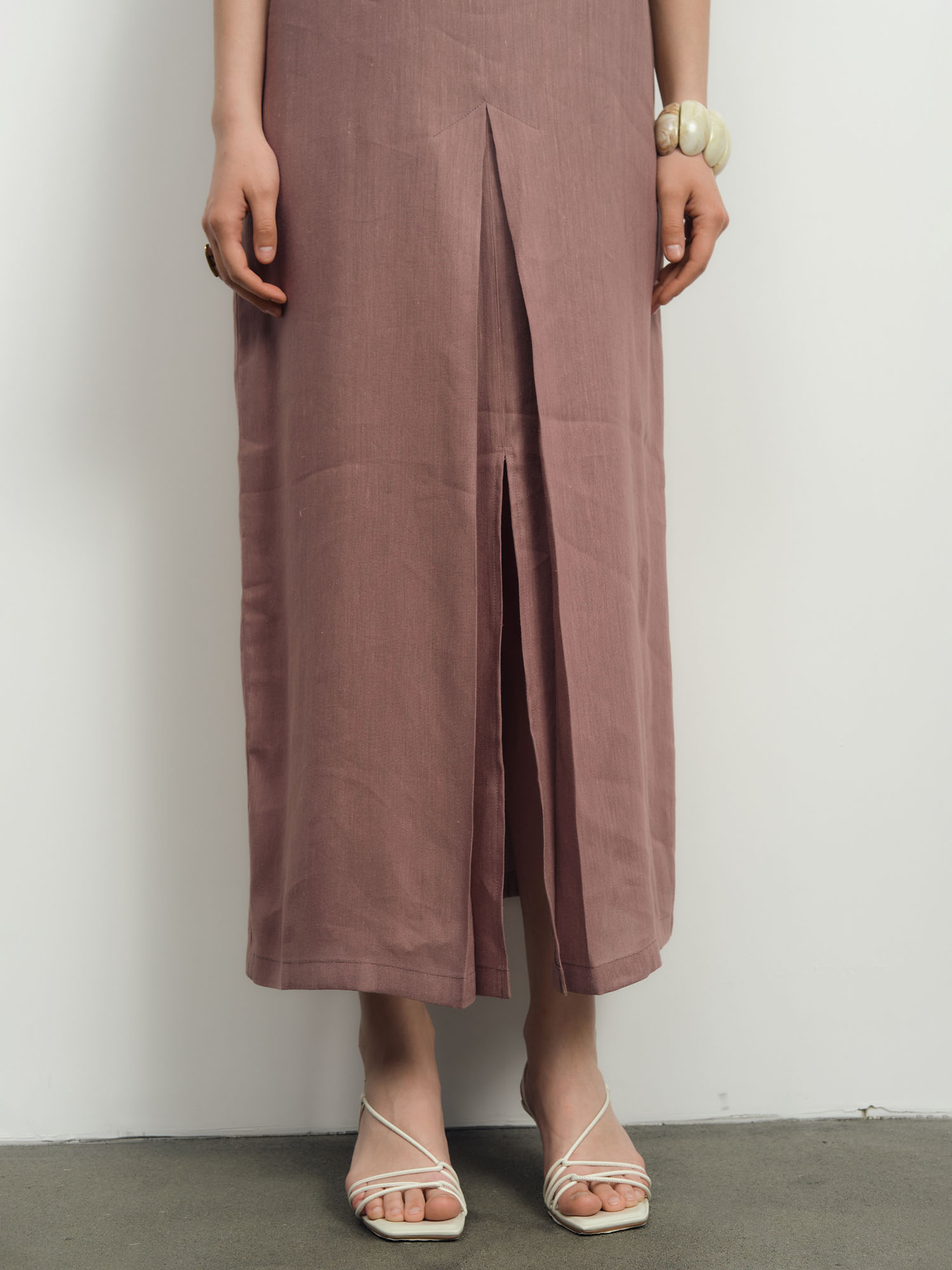 Прямой силуэт длины миди с V-образным вырезом и короткими рукавами. Лаконичный крой подчеркивает естественность и современный стиль.