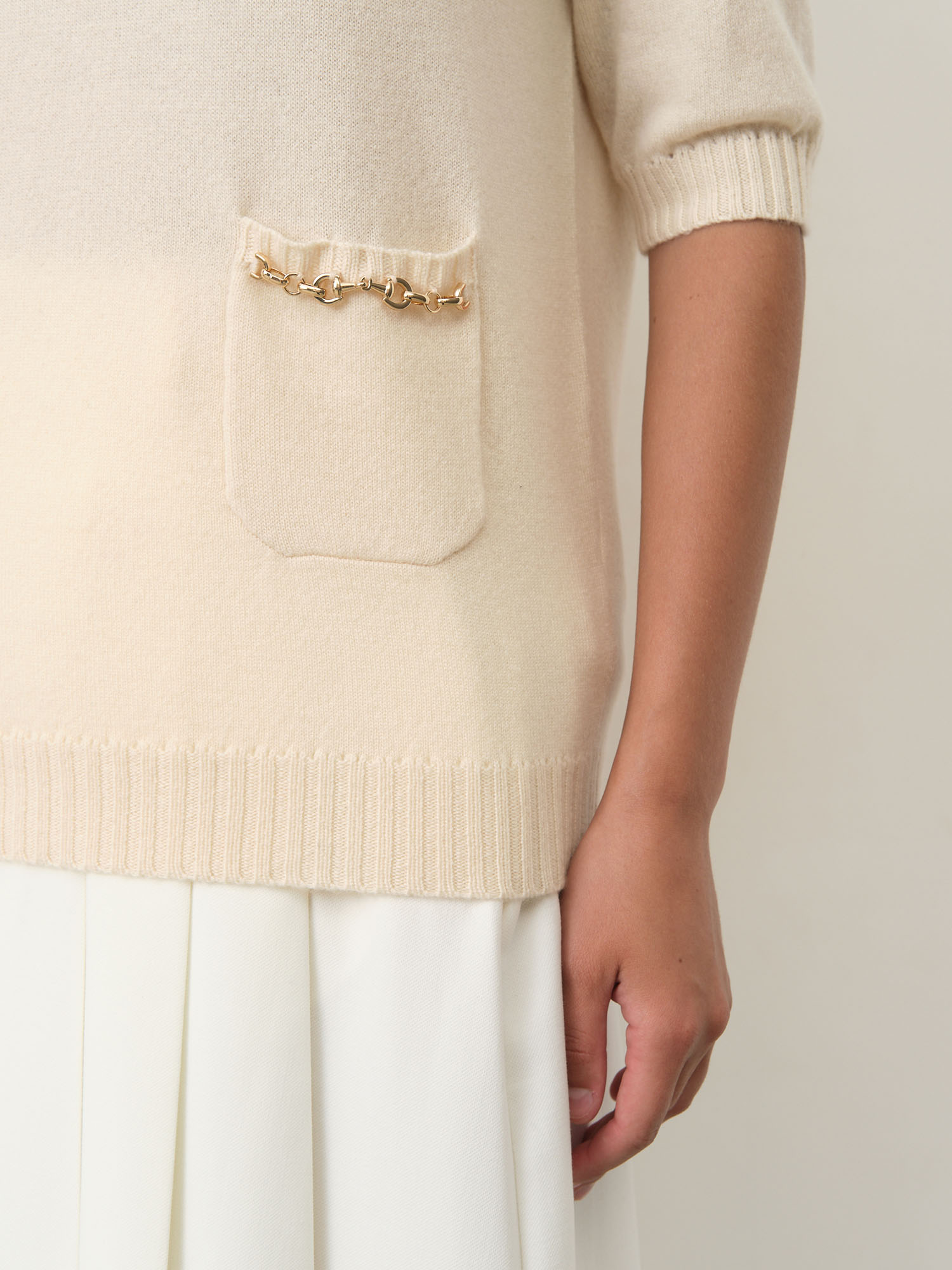 Модель выполнена с круглой горловиной и укороченными рукавами до локтя. Передняя часть украшена аккуратными декоративными карманами с небольшими бантиками, которые придают изделию женственный и изящный акцент. Гладкая вязка подчеркивает благородную текстуру материала.