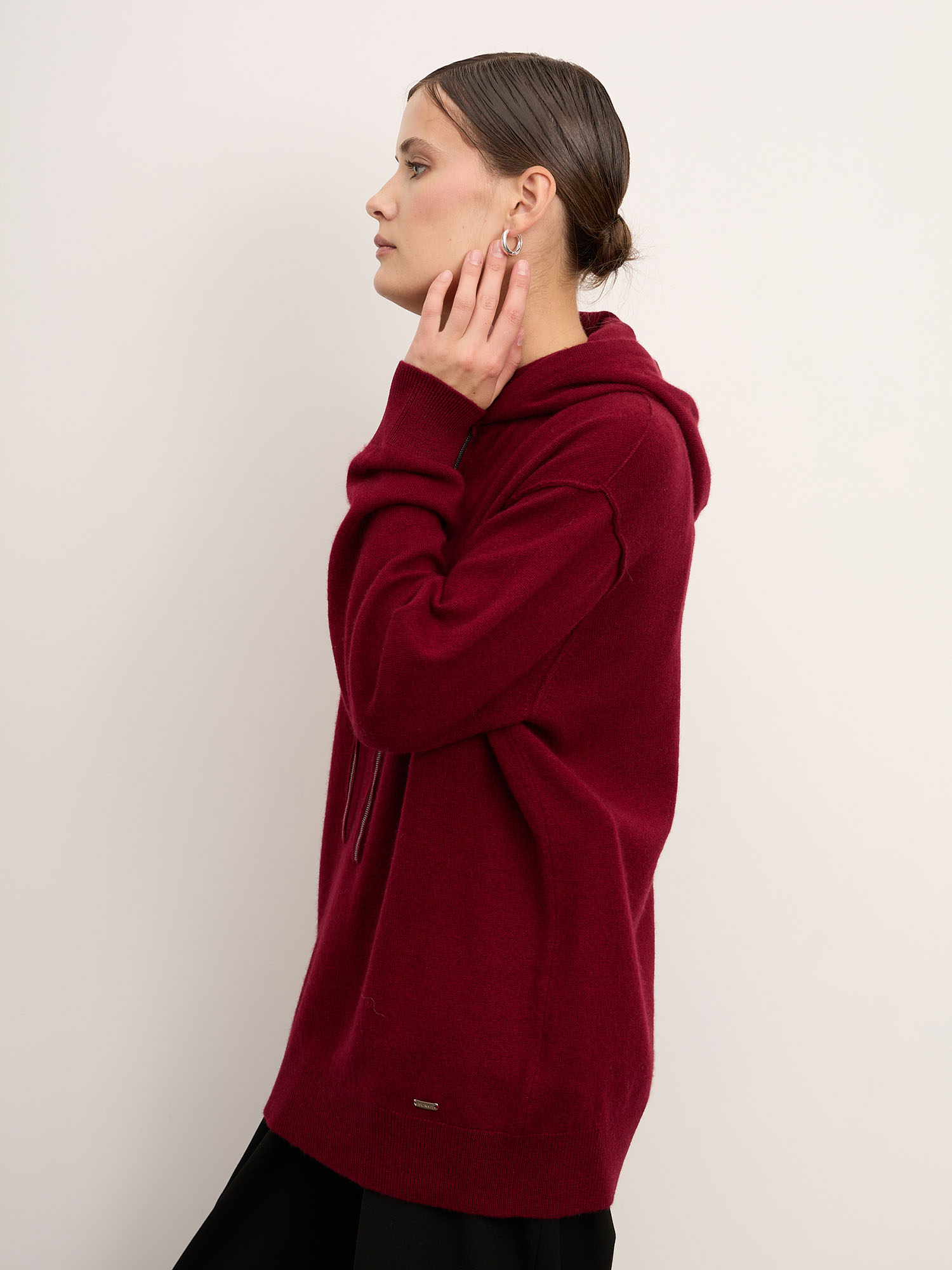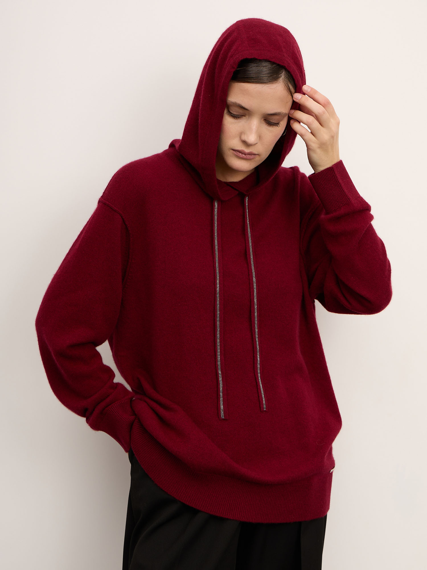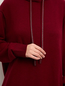 Объёмный джемпер с капюшоном из 100% монгольского кашемира в насыщенном оттенке бургунди — это сочетание уюта, современного кроя и безупречного качества. Мягкий, дышащий материал создаёт ощущение тепла и лёгкости, а глубокий винно-красный цвет придаёт образу выразительность и характер.