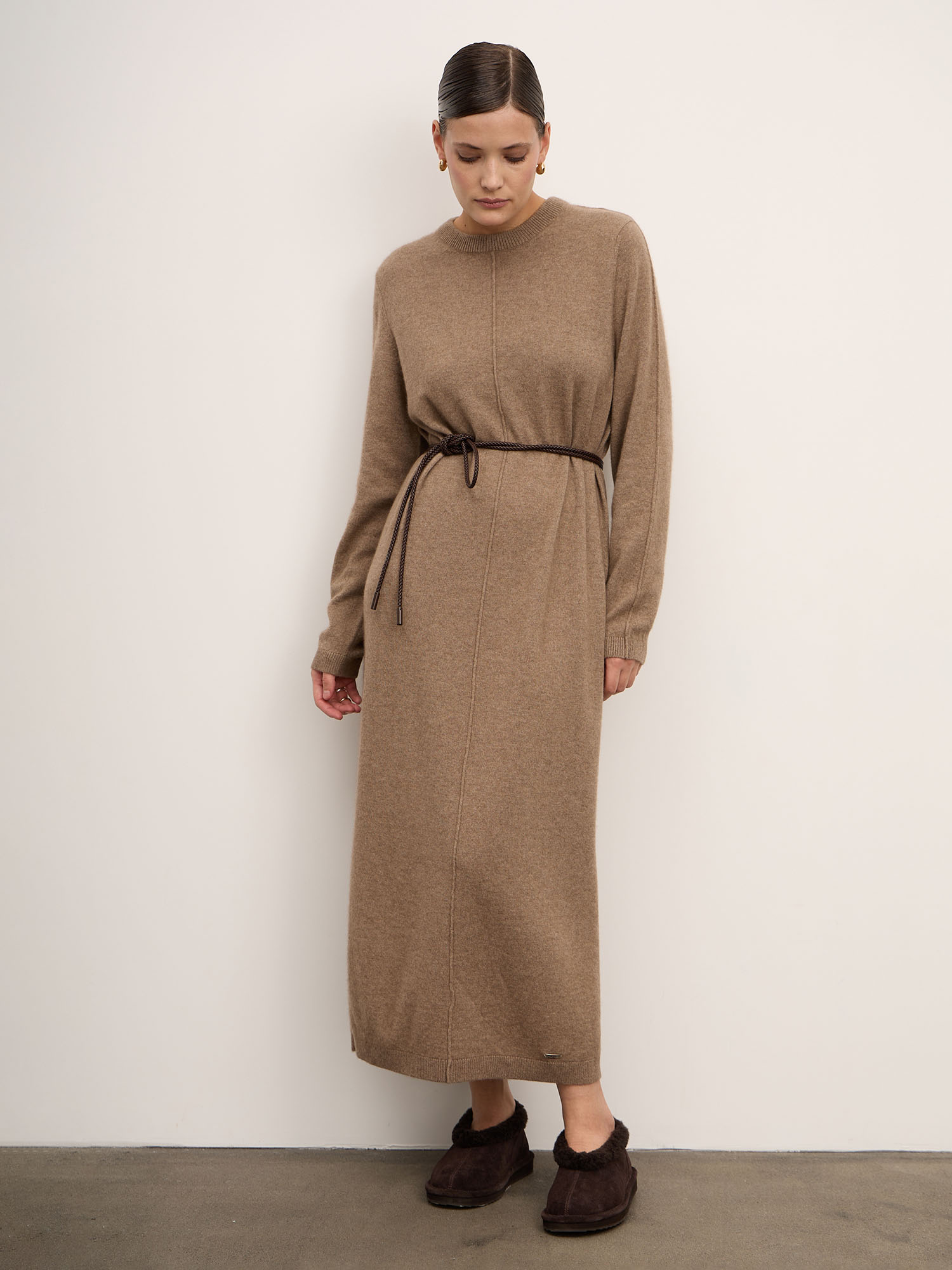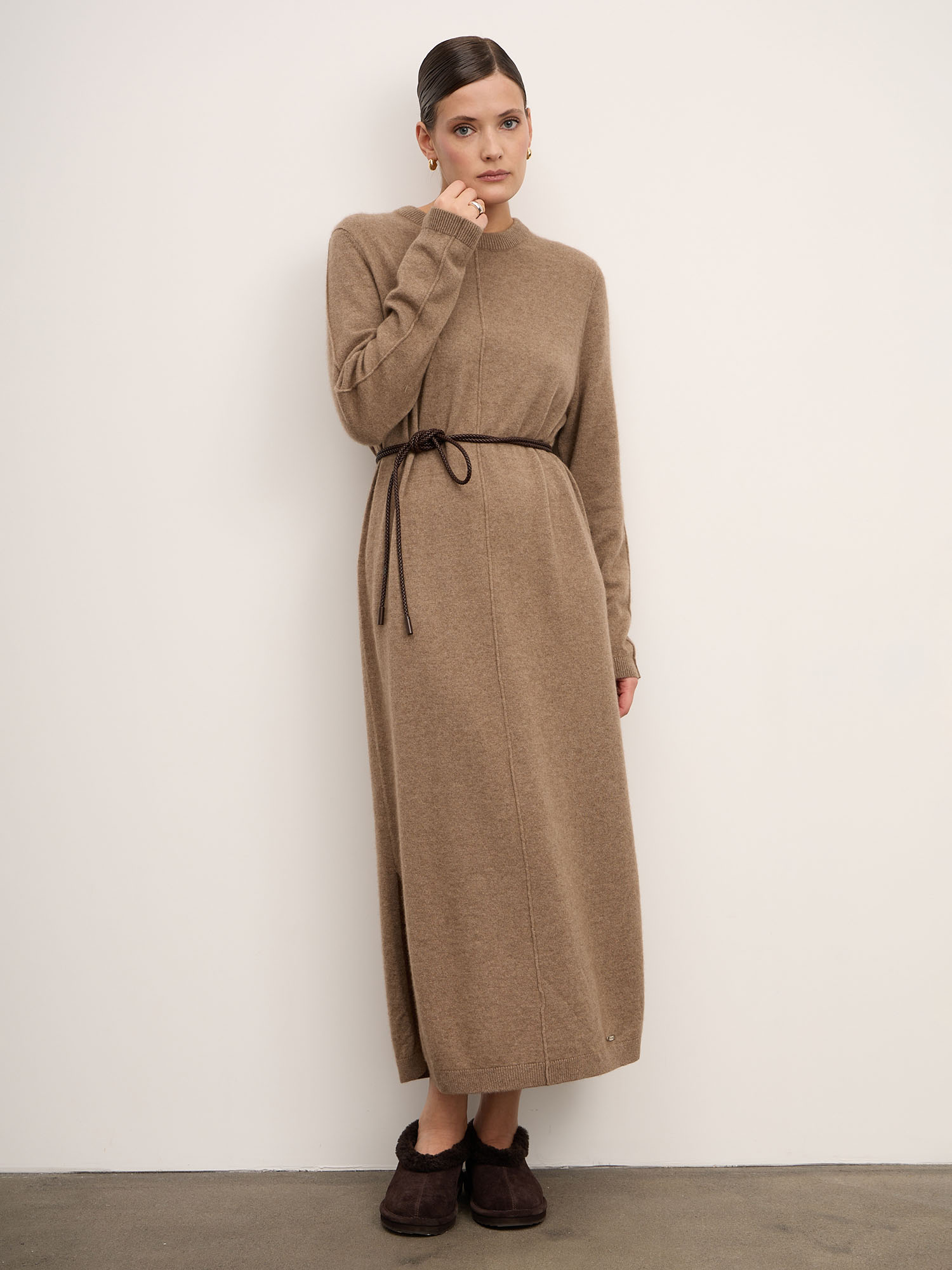 Платье из кашемира — изысканная модель в минималистичном стиле, сочетающая комфорт и элегантность. Свободный силуэт и мягкая фактура делают его идеальным выбором для повседневных образов с акцентом на уют и утончённость.
